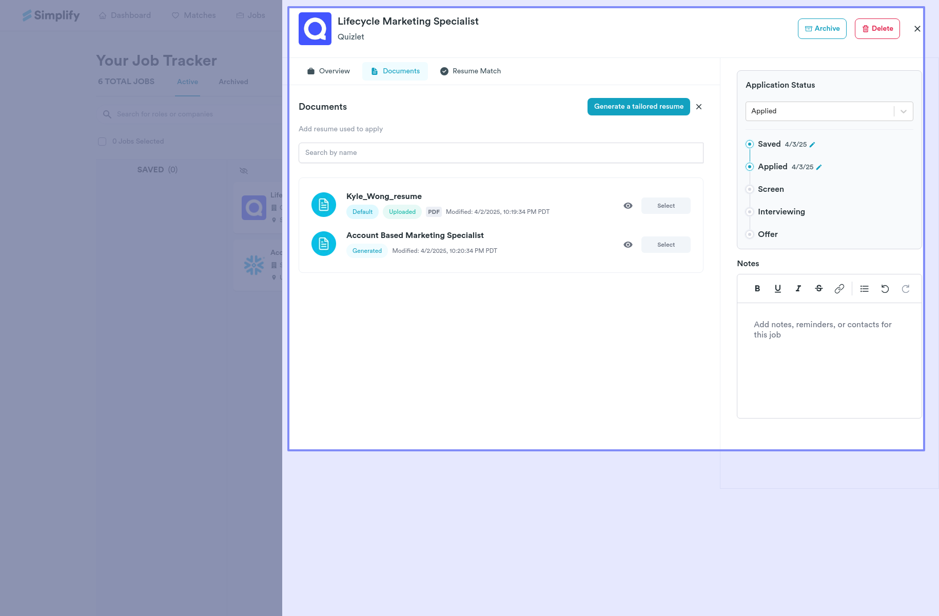 I would love to have a button where I can directly add a PDF of my resume from my computer into this job tracker section since I didn’t get to add it into my profile’s existing resumes, and it’s inconvenient to move away from this page to add in the customized resume while I’m editing this job description in the tracker