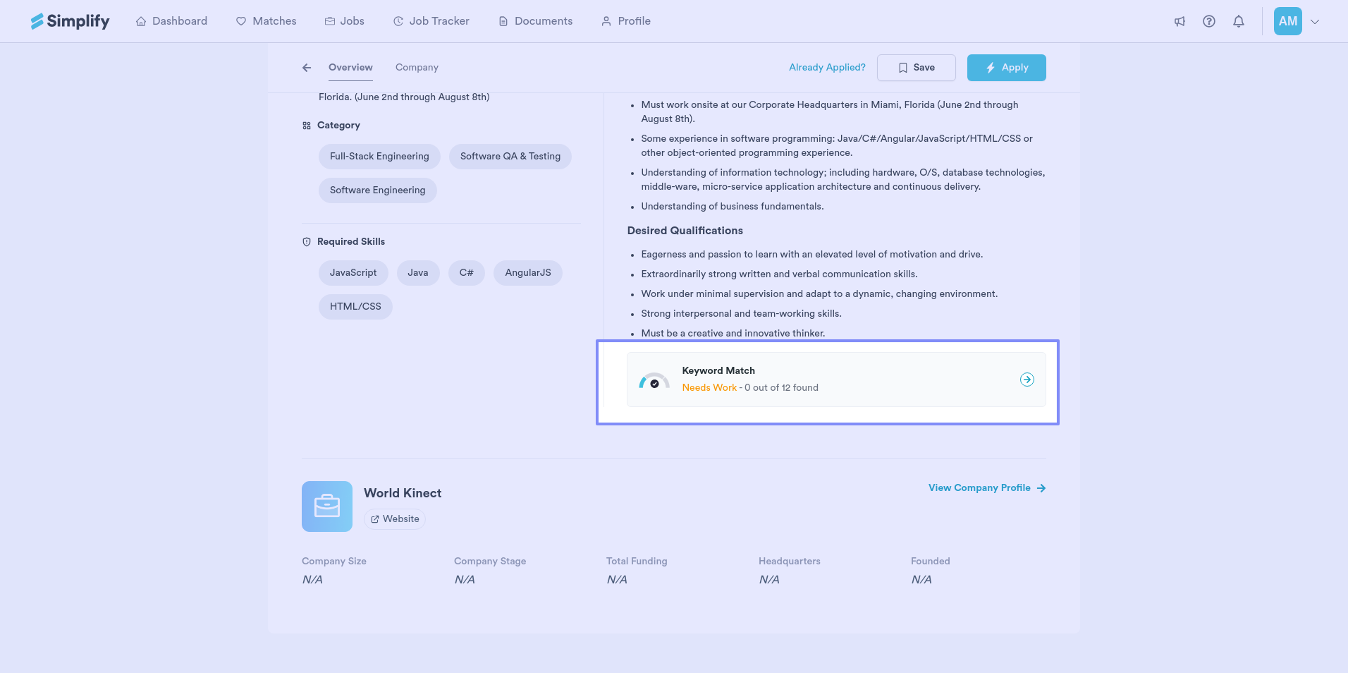 The keywords match of the job overview is always on 0. However, once a user clicks on the “apply” button and heads to the job website, the keyword match gets updated accurately.